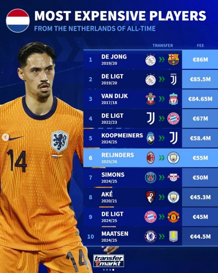 6月11日讯 曼城官宣赖因德斯加盟,固定转会费5500万欧。据德转数据统计,赖因德斯转会费在荷兰球员转会费中排在第6。