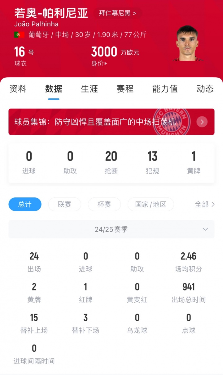 30岁的帕利尼亚上赛季仅为拜仁出场25次,且大部分时间为替补登场。他去年加盟拜仁,合同将在2028年到期。