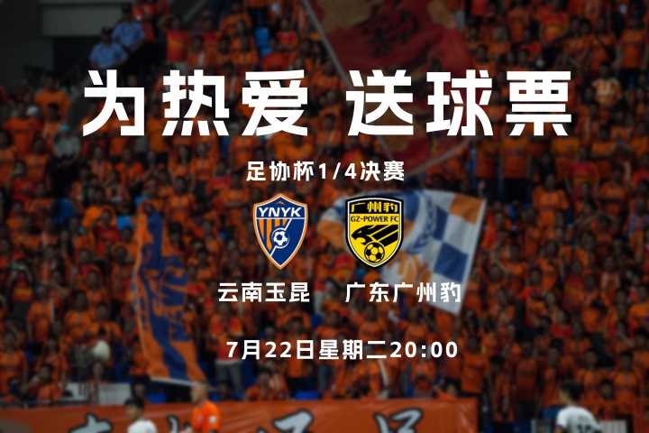 北京时间7月22日星期二20:00,足协杯1/4决赛,云南玉昆坐镇主场玉溪高原体育场迎战广东广州豹。小吧作为赛事版权方和云南玉昆媒体合作伙伴,又又又来送球票大礼啦。