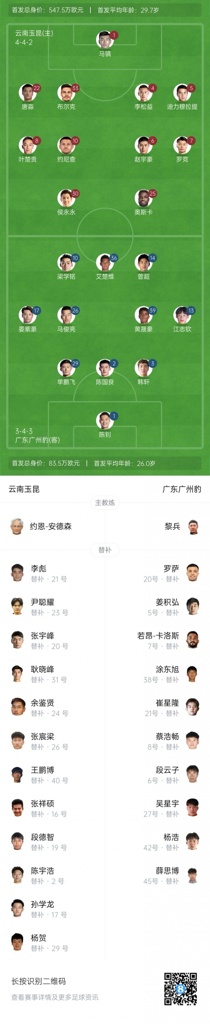 云南玉昆首发:1-马镇、4-李松益、5-迪力穆拉提、22-唐淼、33-布尔克(F)、6-赵宇豪、7-罗竞、8-叶楚贵、10-约尼查(F)、25-奥斯卡(F)、30-侯永永