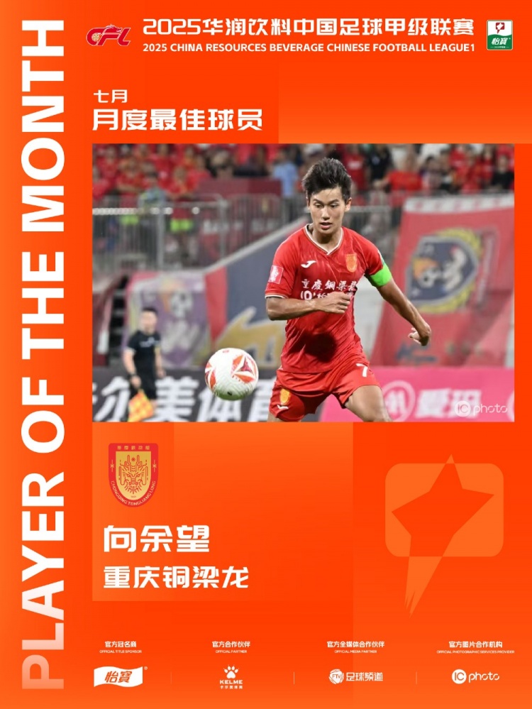 8月14日讯 中甲联赛官方公布了7月最佳球员,重庆铜梁龙球员向余望成功当选,他在4场比赛中攻入6球。
