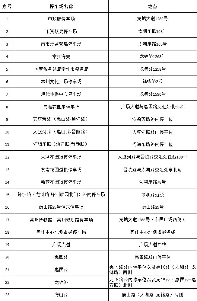 机动车停车:含市政府停车场(请关注“常州机关勤e家”微信公众号,通过“苏超”专栏预约入场)在内的部分党政机关、事业单位、广场道路等空间对外开放,提供6000个车位供车辆临时停车。