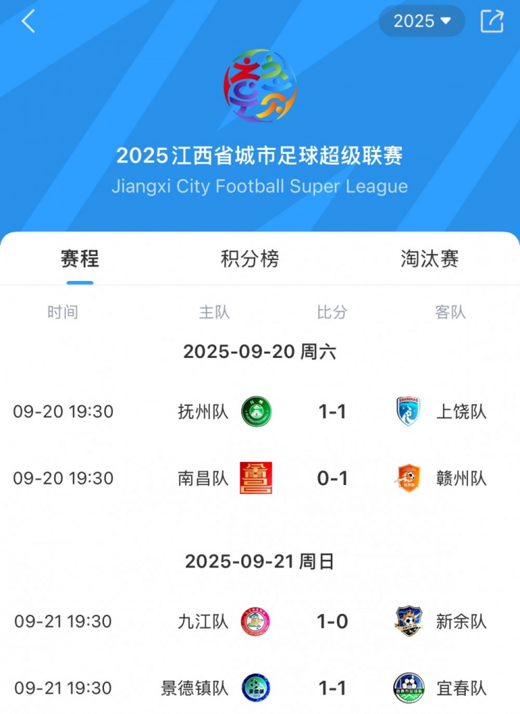 9月21日讯 2025赣超联赛1/4决赛首回合全部比赛于今晚落下帷幕,其中小组赛位列北区第一的九江队主场1-0击败新余队,取得晋级先机;南区第一宜春队客场1-1战平景德镇队。
